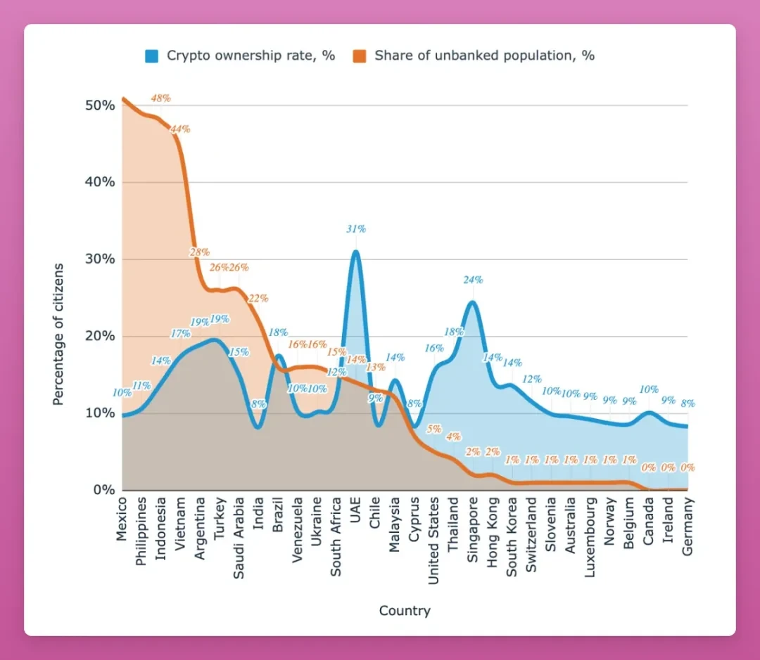 我最认可的一组数据,是加密货币渗透率与无银行账户人口比例的关联分析:无银行账户人口比例越高的国家,加密货币持有率也越高。加密货币正填补传统金融体系的服务空白。