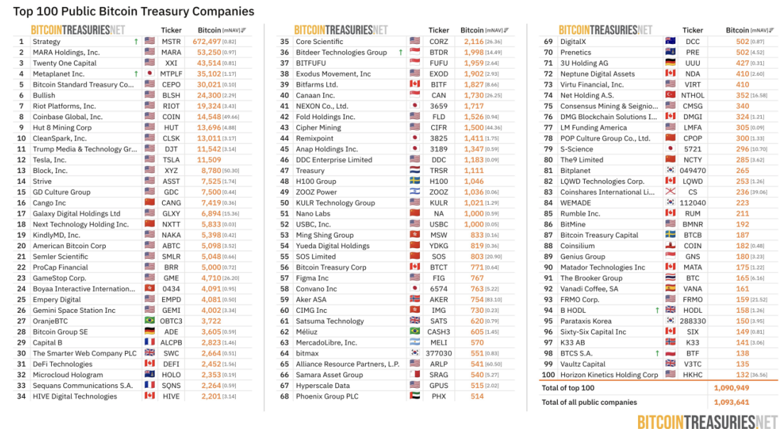 图5: Bitcointreasuries官网全球TOP100 BTC财库上市公司统计图