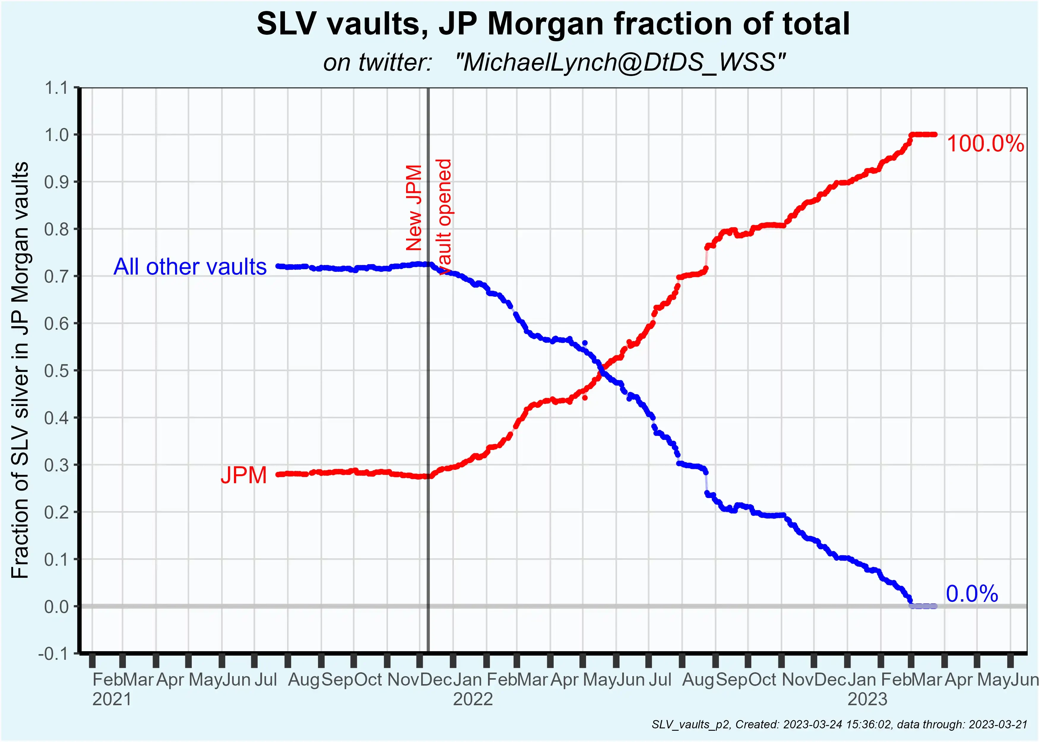 摩根大通在 2021 年 11 月开设新库房后,逐步接管了 SLV 的所有白银库存