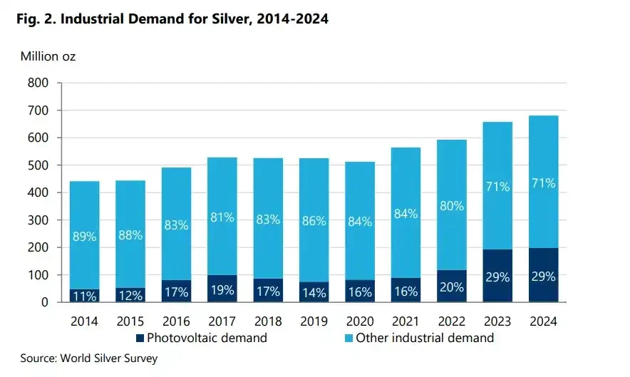 且导电银浆是光伏电池的核心材料,目前尚无可替代方案。2024 年,全球光伏用银量达到 6147 吨,占全球白银总需求的近三成,规模已与全球银饰珠宝需求总和相当。