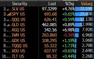 当日全球最大的白银 ETF iShares Silver Trust (SLV) 当日成交量高达 320 亿美元,是其日均成交量的 15 倍,甚至超过了标普 500 ETF(SPY)、英伟达(NVDA)和特斯拉(TSLA)的总和,成为全球成交量最大的证券。