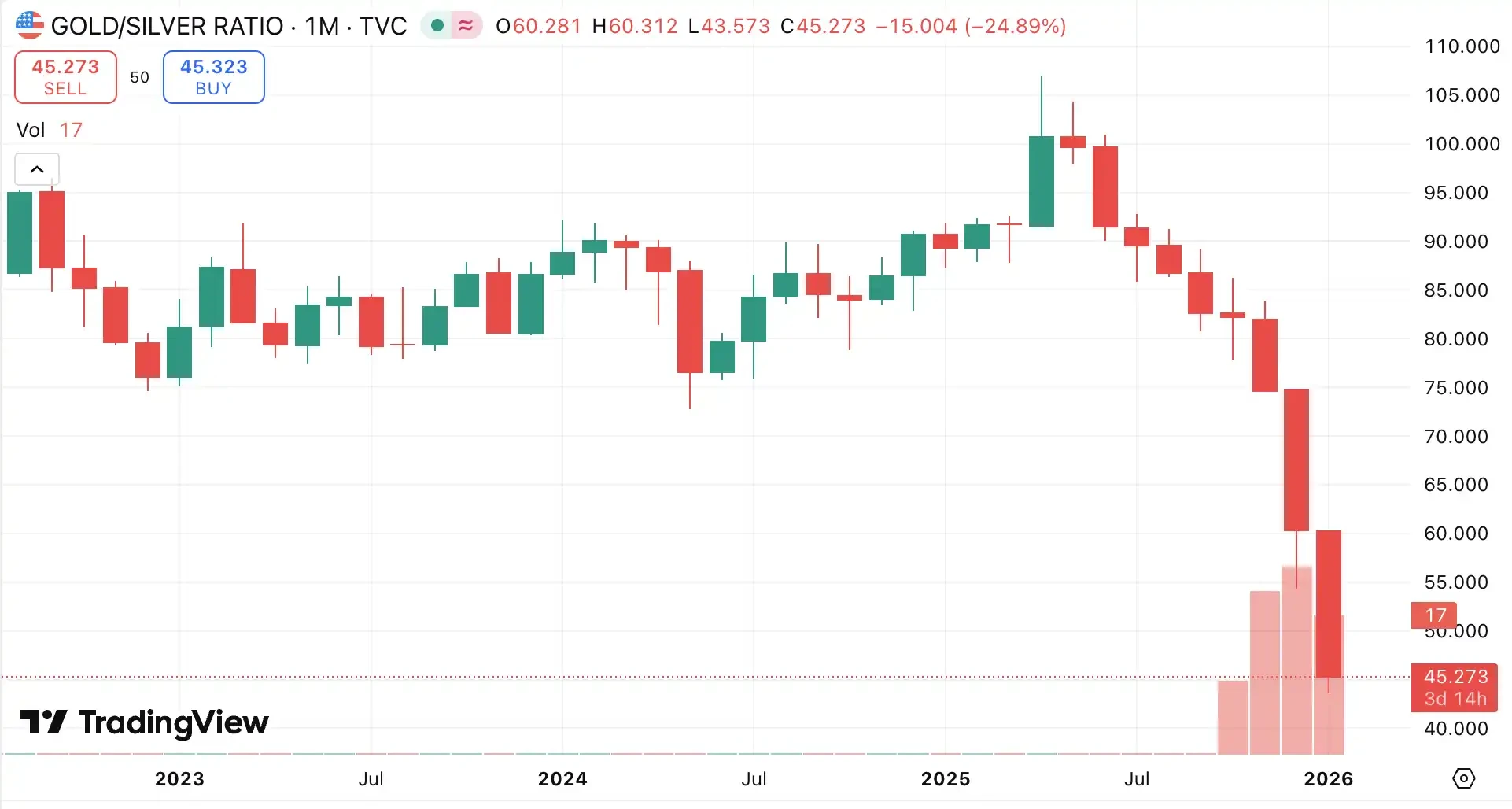 当前金银比已跌破 50,从去年年 的 103 直接被腰斩还多,创下近 14 年来的新低。历史上,金银比的长期均值在 60-70 之间,跌破 50 是明确的白银价值重估信号