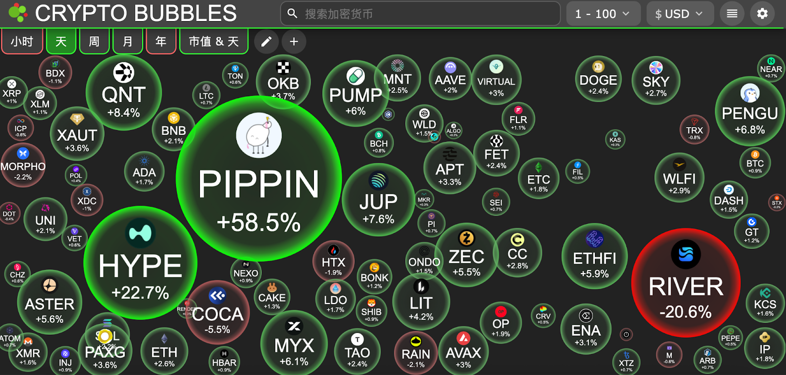 今日市值前100币种最大涨幅:Pippin 涨 58.6%、Hyperliquid 涨 22.5%、Quant 涨 8.4%、Jupiter 涨 7.4%、Pudgy Penguins 涨 6.6%。
