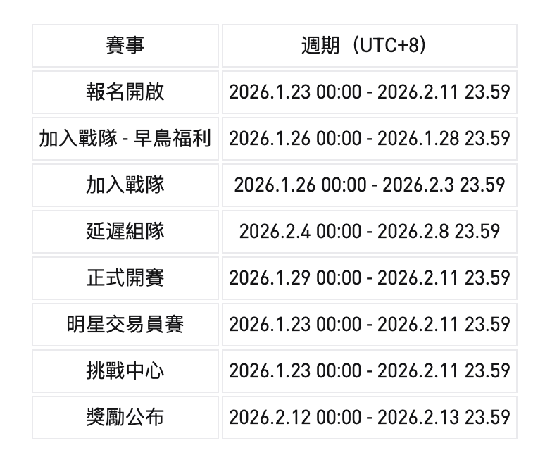 在 2026.1.26 0:00 – 2026.1.29 00:00 (UTC+8) 期間加入戰隊成功組隊且股票合約交易額 ≥ 10,000 USDT 的前 10,000 名用戶,將獲得 20 USDT 體驗金。