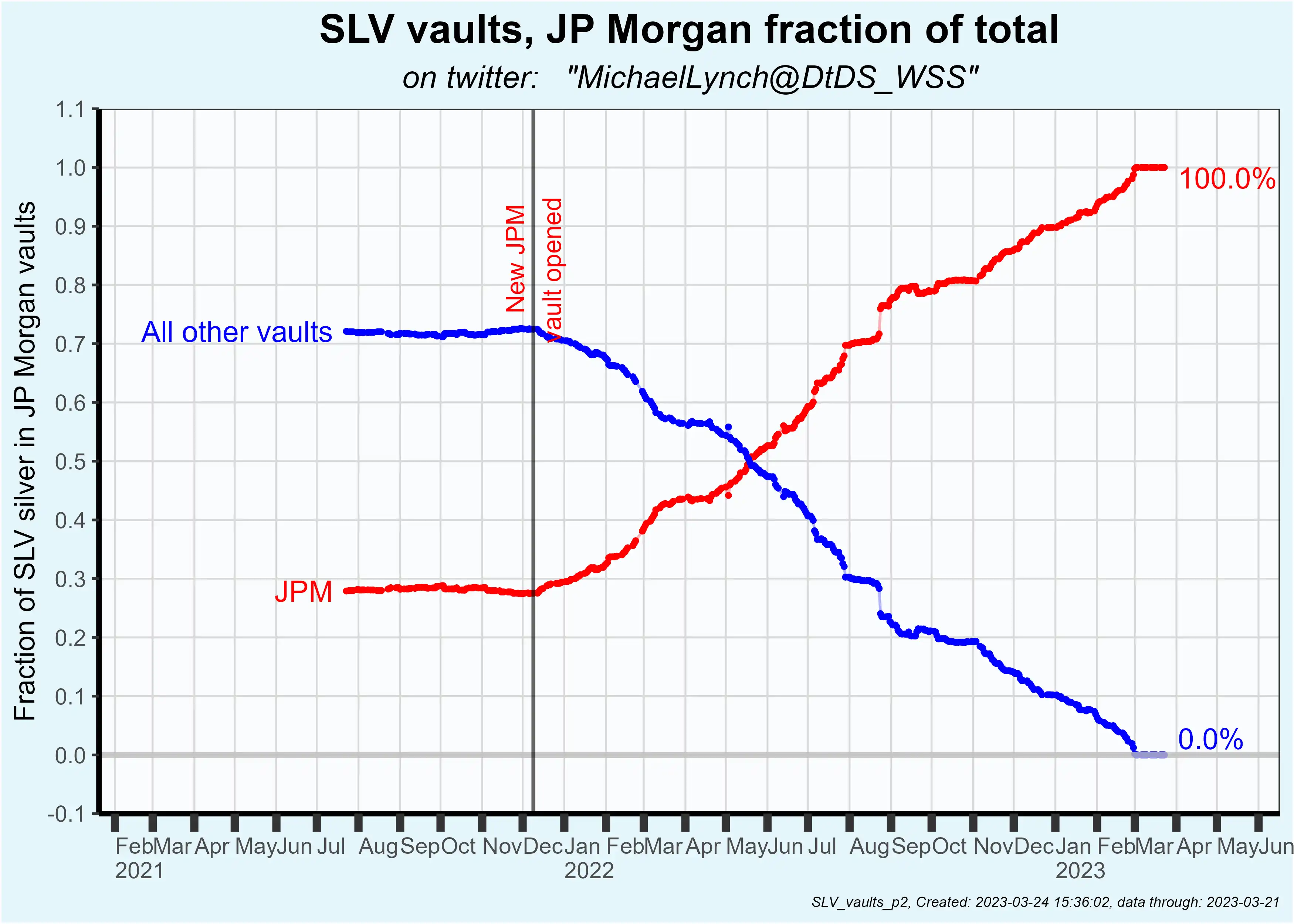 摩根大通在 2021 年 11 月開設新庫房後,逐步接管了 SLV 的所有白銀庫存