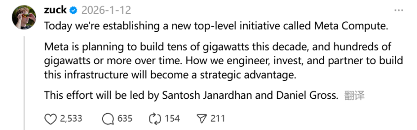 更具战略意义的,是 Meta 对算力与基础设施的重新定级。扎克伯格 1 月 12 日亲自发帖,表示「启动了一个名为 Meta Compute 的全新的最高级别战略项目」,按照披露信息, Meta 计划在 2028 年前,在美国的数据中心与相关基础设施上累计投入至少 6000 亿美元。