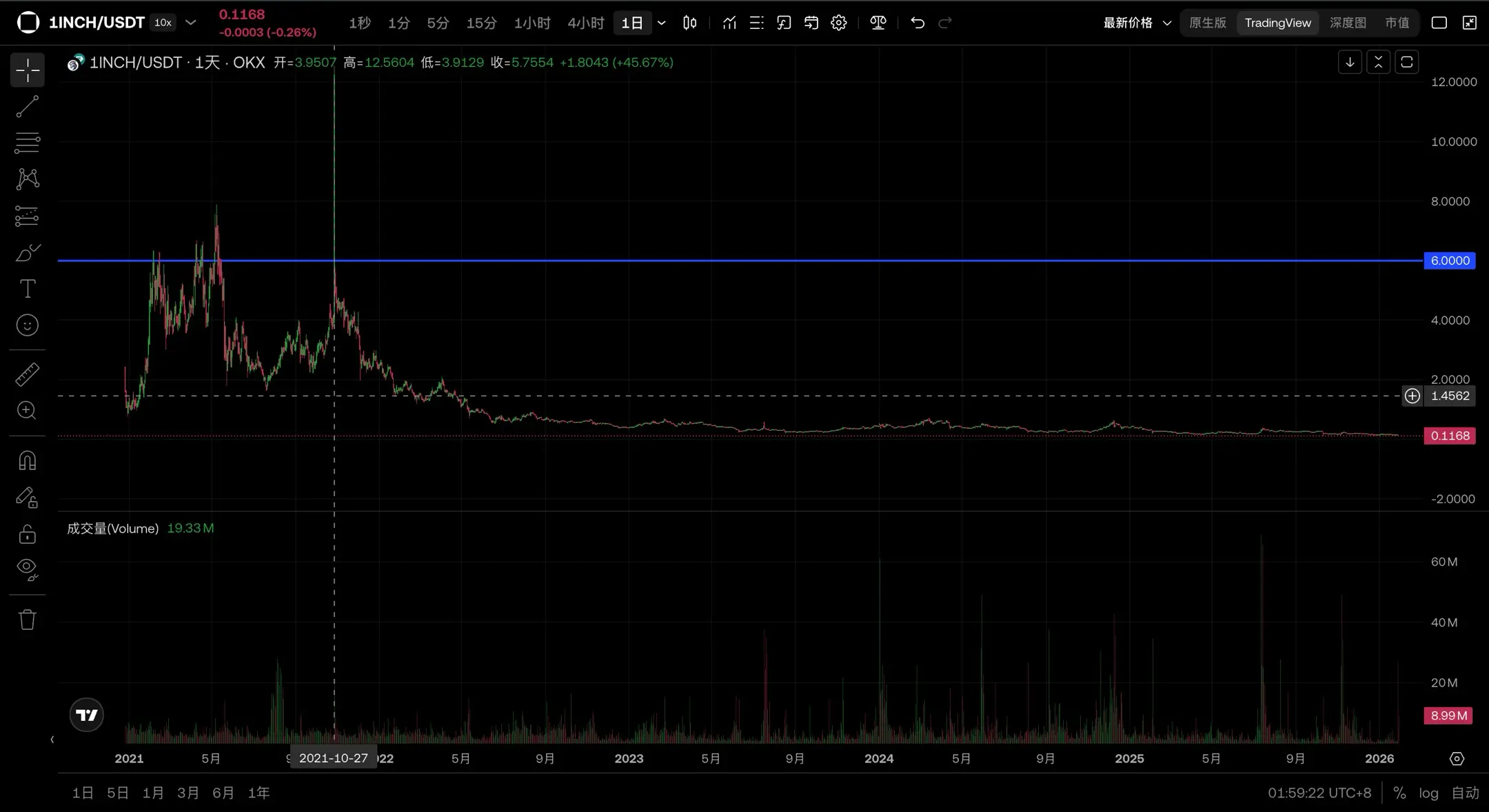 然而,即便最终被证明是一场误读,这次卖出对 1INCH 本就持续走弱的价格而言,依然构成了现实层面的二次冲击。自上一轮周期高点 6 美元 起,1INCH 已经历了长期的单边下行,如今徘徊在 0.11 美元 附近。
