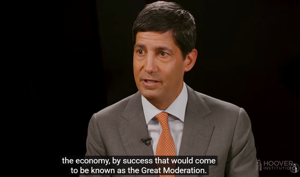 你已经用了这个词几次了。让我们定义一下。“大稳健”时期始于80年代中期,当时沃尔克和美联储,可以说是在罗纳德·里根任内,真正将通胀降到较低的个位数,并且通胀一直保持在那里,经济持续扩张,直到2008年危机,中间只有几个季度的衰退,持续了大约四分之一个世纪。我说得对吗?这就是你所说的“大稳健”吗?