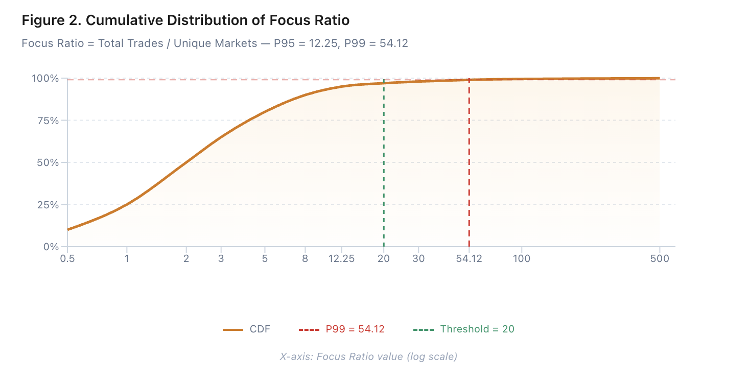 • 垂直异常(深耕型) :极少数市场,但交易极多。这类地址通常是做市商脚本,Focus Ratio 峰值甚至可达 39,394 。