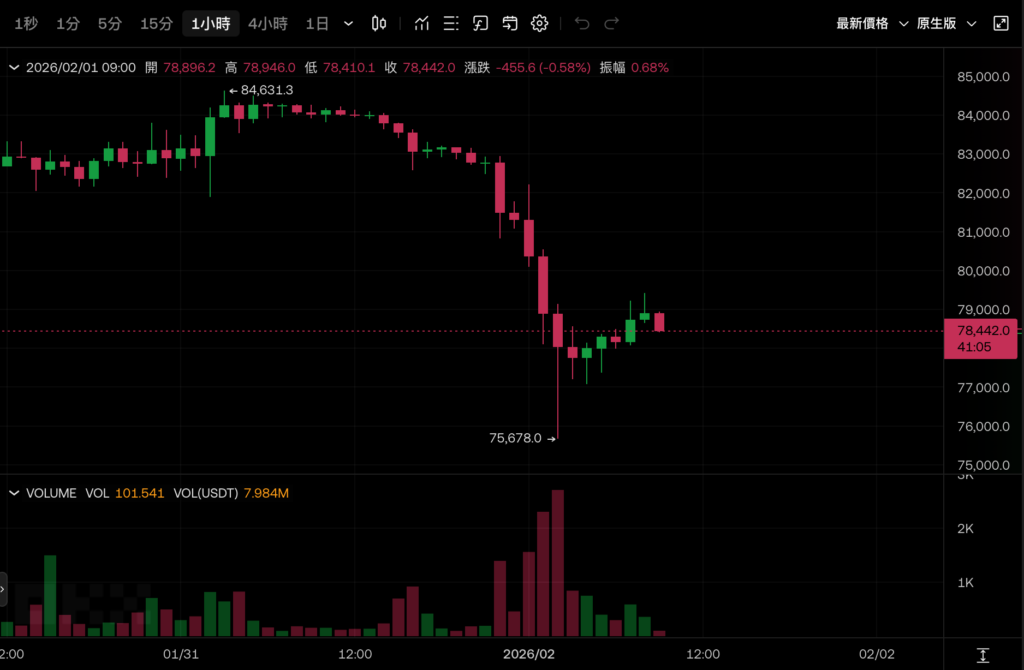 今(1)日午夜點點多,最低插針至 75,678 美元,創下 2025 年 4 月以來的最低點。截稿前暫時反彈站回 7.8 萬美元,過去 24 小時跌幅收斂到 6.3%。