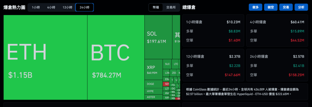 根據 Coinglass 數據,這場崩盤讓市場蒸發了近 1,800 億美元的市值。過去 24 小時造成超過 42.6 萬名投資者爆倉出局,其中最大單筆爆倉單發生在 Hyperliquid 的 ETH-USD(價值 2.2 億美元)
