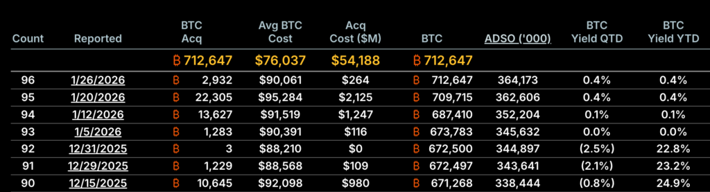 根據 Strategy 官方持倉紀錄 ,截至 2026 年 1 月 25 日,該公司共持有 712,647 枚比特幣,總收購成本約 541.8 億美元,換算平均成本為每枚 76,037 美元。