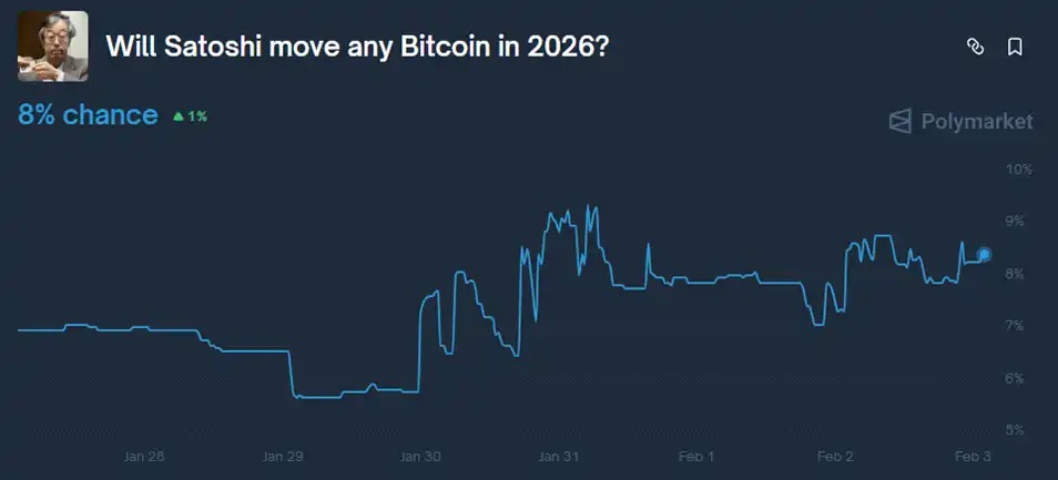在这批最新的爱泼斯坦文件披露后,预测市场 Polymarket 上「中本聪的比特币地址在 2026 年出现动作」的可能性从约 6% 一度上升到约 9.3%,目前维持在 8%。