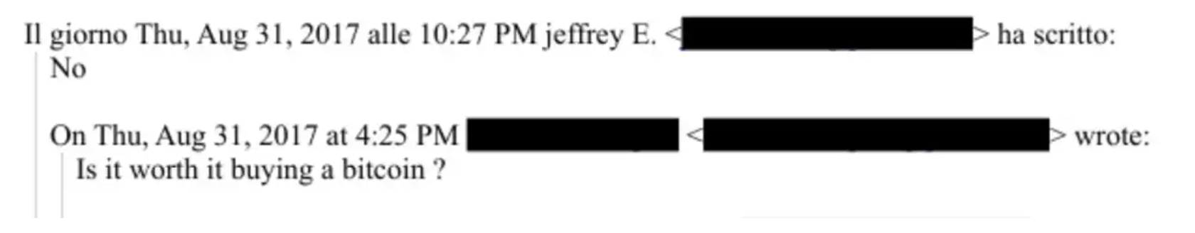 如果爱泼斯坦真的见过中本聪,那么似乎中本聪并没有在和爱泼斯坦的接触中向他成功布道比特币。在 2017 年 8 月 31 日的往来邮件中,爱泼斯坦回复「是否值得买一个比特币」的问题时,他干脆地回复了「No」。而当时,一个比特币还不到 5000 美元。
