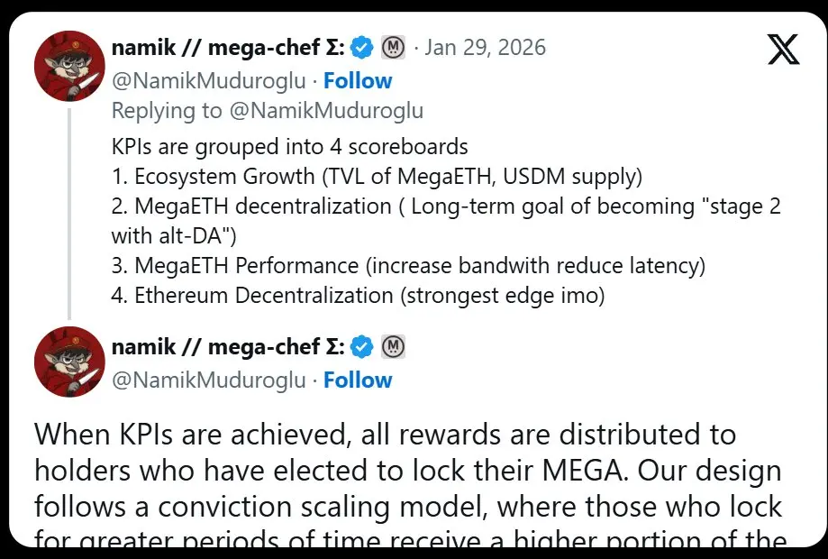 这个 KPI 计划中另一个有趣的因素是,当 KPI 达成时,哪些投资者会获得 MEGA。根据 Namik 的推文,获得 MEGA 解锁的人是那些将 MEGA 质押到锁定合约中的人。