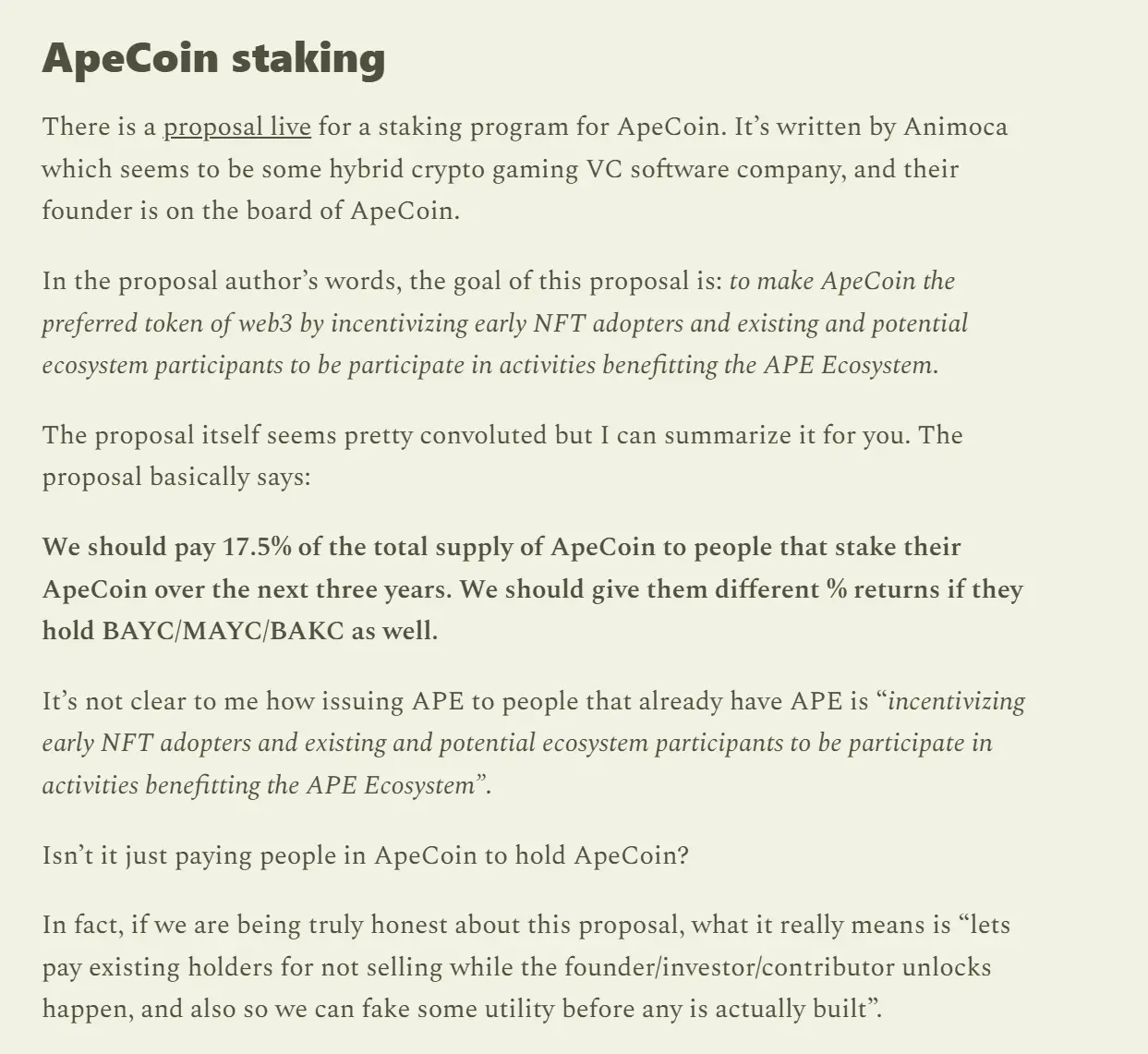 值得强调的是这也带来的风险。我们已经看到过类似结构在历史上出现严重问题的例子。请参阅 Cobie 文章中的这段节选:“ ApeCoin 与质押的消亡 ”