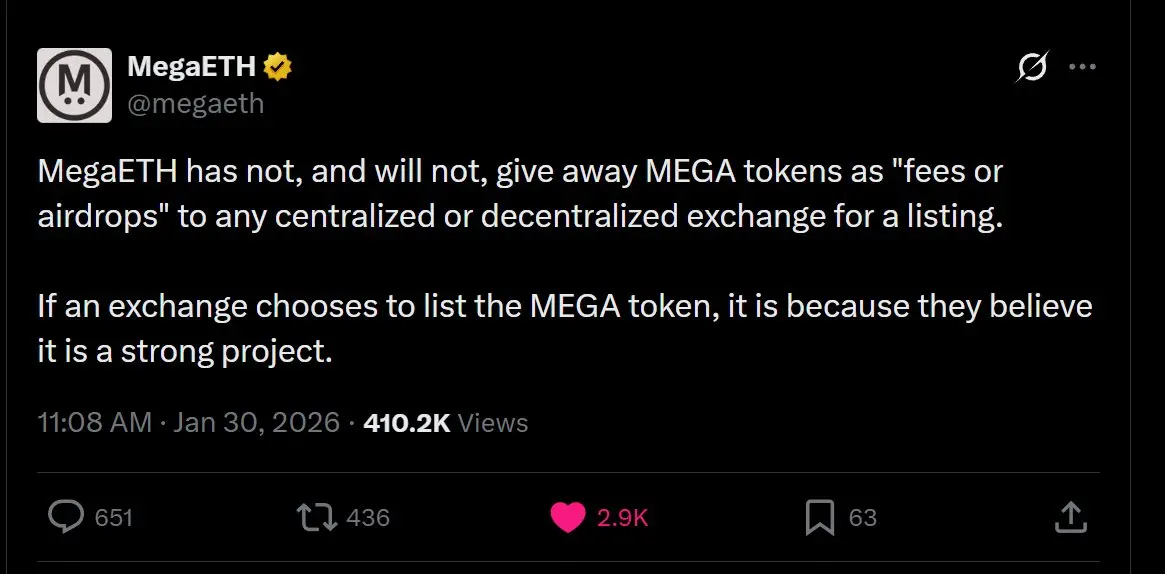 你在 MegaETH 对待 CEX(中心化交易所)上市的理念中也能看到这种同样的道德准则,尤其是在币安在其平台上开放 MEGA 代币期货之后(这是币安历史上试图以此敲诈团队索要代币的手段)。
