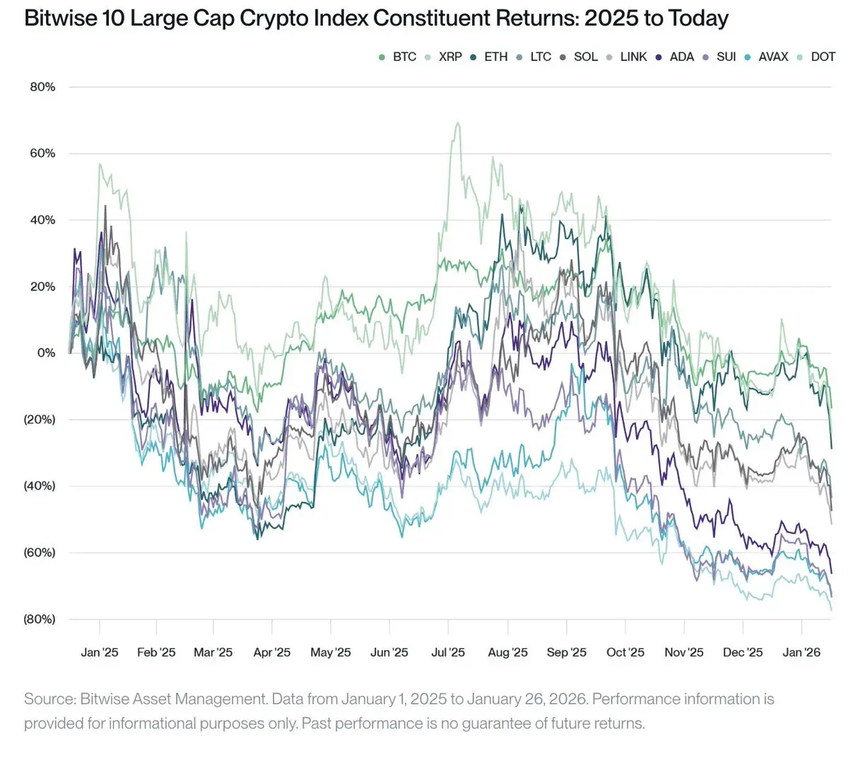 它清晰地分为三组。第一组资产(BTC、ETH、XRP)表现尚可,下跌了10.3%至19.9%。第二组资产(SOL、LTC、LINK)经历了标准的熊市,下跌了36.9%至46.2%。但第三组资产(ADA、AVAX、SUI、DOT)遭遇重创,跌幅高达 61.9% 至 74.7%。