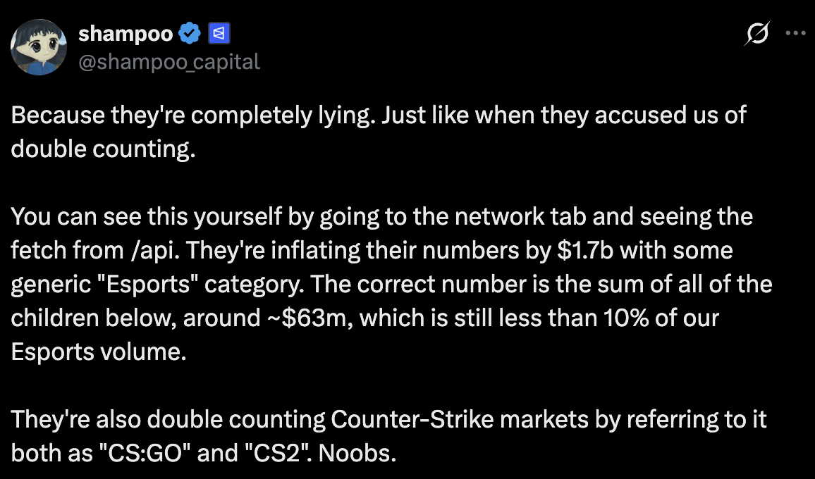 社群近日熱議「電競數據灌水 17 億美元」指控,來源是 Polymarket 團隊成員 Shampoo,他在回應 Paradigm 的預測市場監控工具時提出質疑: