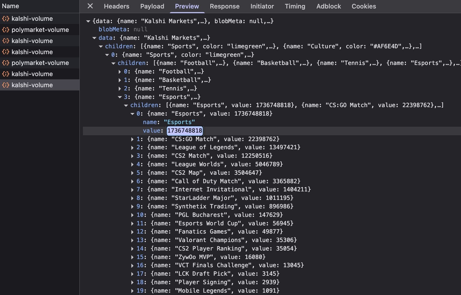 你自己打開瀏覽器的 Network (網路)分頁,看從 /api 抓回來的資料就知道了。他們用一個很籠統的「 Esports (電競)」分類,把自己的數字虛增了 17 億美元。正確的數字是底下所有子分類相加,大約只有 6,300 萬美元,還不到我們 Esports 成交量的 10% 。
