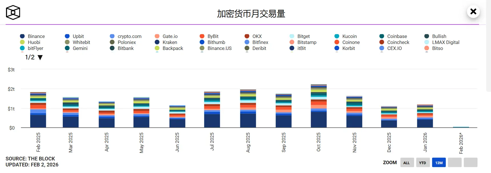 进入 2026 年,情况进一步恶化。数据显示,主要 CEX 现货交易量从 2025 10 月的约 2 万亿美元骤降至 1 月的 1 万亿美元区间,回落至 2024 年以来的低位。