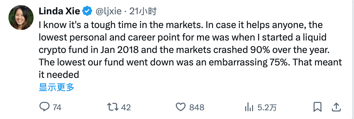 我知道现在的市场环境很难。希望这些经历能对一些人有所帮助。对我来说,个人和职业的最低点,是在 2018 年 1 月启动一家加密流动性基金后,当年市场下跌了 90%。我们的基金最大回撤达到令人羞愧的 75%,这意味着基金需要涨 4 倍才能回本。