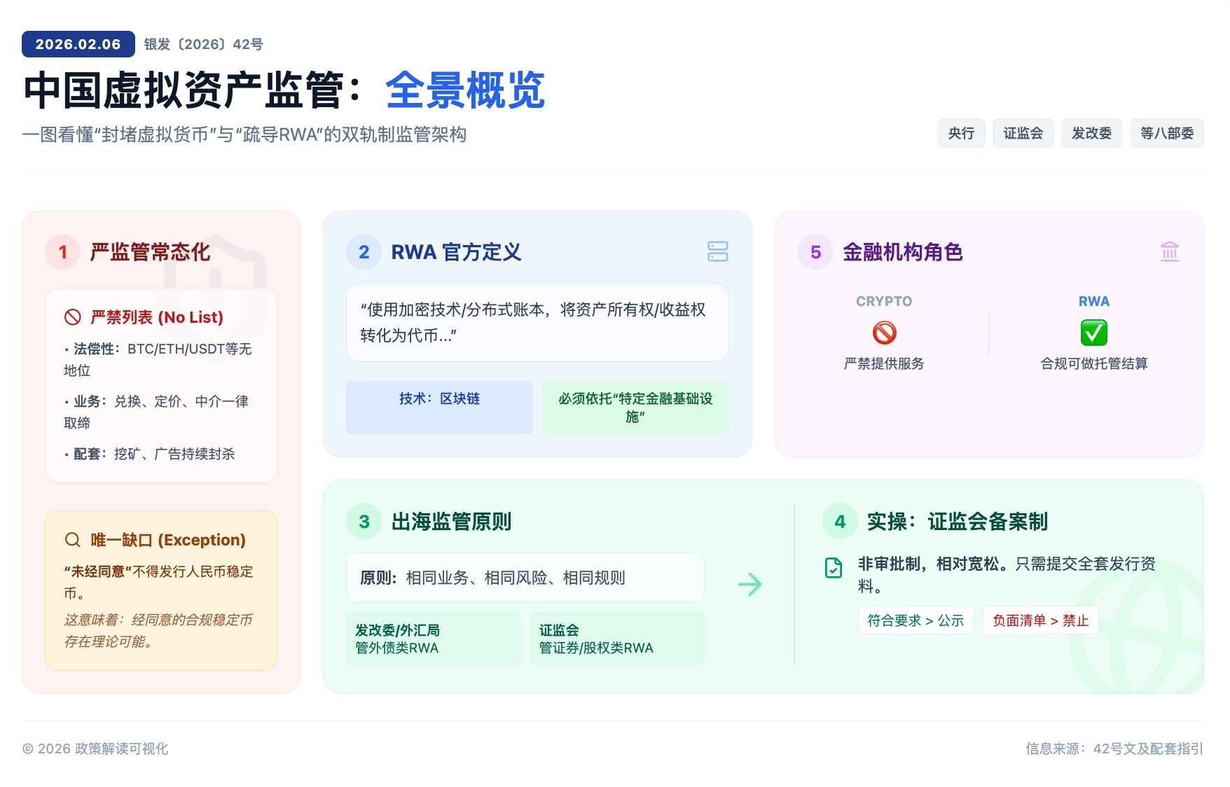 就在今天,中国人民银行联合国家发改委、工信部、公安部、市场监管总局、金融监管总局、证监会、外汇局八大部门,发布了《关于进一步防范和处置虚拟货币等相关风险的通知》(银发〔2026〕42号)。与此同时,一份更具实操意义的附件——《关于境内资产境外发行资产支持证券代币的监管指引》也一并出炉。