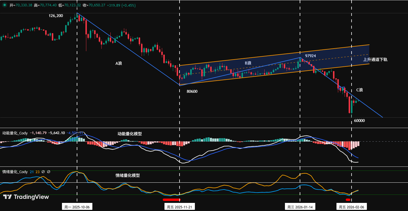 • 78 段(V 型反转): 图中虚线部分。 反弹异常强劲,不仅能有效突破 97,924 美元的前高,并能持续站稳其上,同时金融市场将出现重大利好消息配合 。若此情况发生,则意味着自 126,200 美元开始的整个 A-B-C 三浪调整可能已经以“简化形态”结束于 60,000 美元。尽管概率极低,但其触发条件(强势突破 97,924 美元)清晰可辨,可作为趋势逆转的关键观察信号。