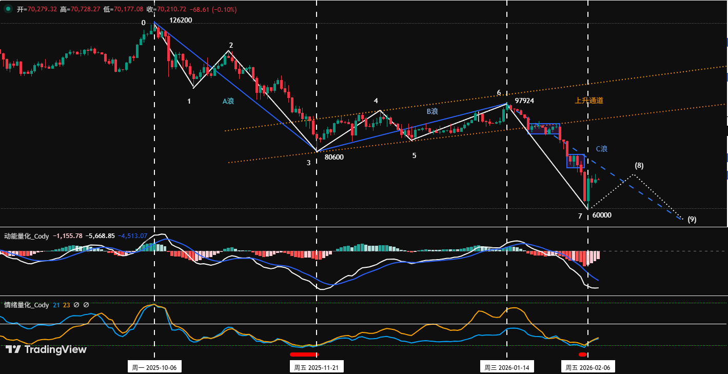 • 6-7 段(首轮驱动下跌), 目标已完成:97,924 美元(2026-01-14)至 60,000 美元(2026-02-06),历时 23 天,最大跌幅 38.7%。(根据调整时间及跌幅判断,60,000 美元是 C 浪内部第一段调整低点的概率大)
