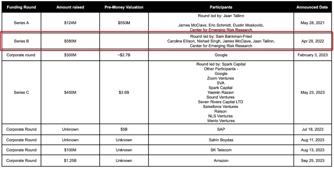 2022 年 4 月(此为官宣日期,交易实际完成于 2021 年),FTX 完成了在 AI 领域最重要的一笔投资 —— 出资 5 亿美元领投了 AI 创企 Anthropic 的 5.8 亿美元 B 轮融资,股权占比一度高达 13.56%,之后随着 Anthropic 陆续完成多轮融资而稀释至 7.84%。