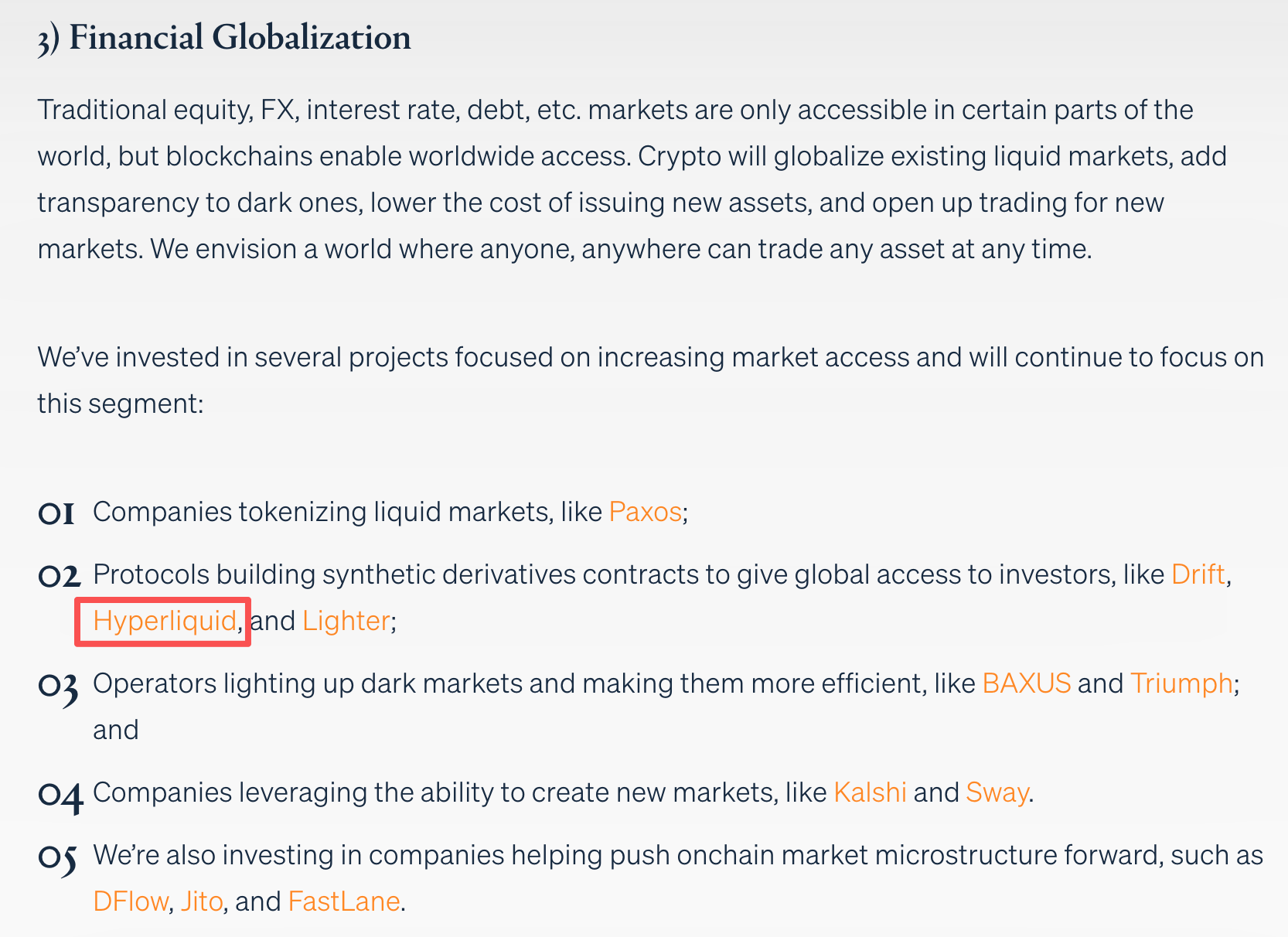 Crypto Banter 创始人 Ran Neuner 则发现,在 Multicoin Capital 另一位联合创始人 Tushar Jain 上周末公布的未来五年投资主线中,Hyperliquid 作为第三条主线“金融全球化”的代表项目赫然在列,而 Kyle Samani 长期以来极度看好的 DePIN 却完全未被提及。