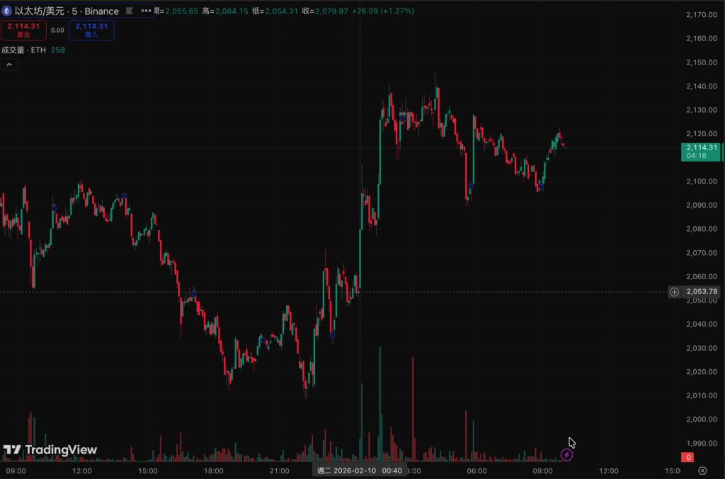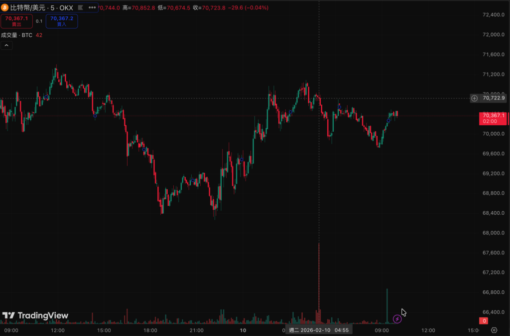 密貨幣市場恐慌情緒有初步回復,今日恐慌指數為9,但昨晚至今晨仍然出現幾波交易量暴衝的橫盤,顯示籌碼面多空仍在交火整合,比特幣自昨日晚間10點左右,隨著美股開盤時間後從68261美元水位直接上升,美股收盤時間後一度衝破 71000 美元,約凌晨四點左右突然出現大量賣盤從 70800 美元水位往下走,截稿前反彈至 70183 美元。以太坊局勢更混亂,從2008美元區間一度衝至 2150 美元後回落,多空交火情勢更為嚴重,現報價 2119 美元,但線圖上相較比特幣有明顯的上升趨勢,值得密切注意。