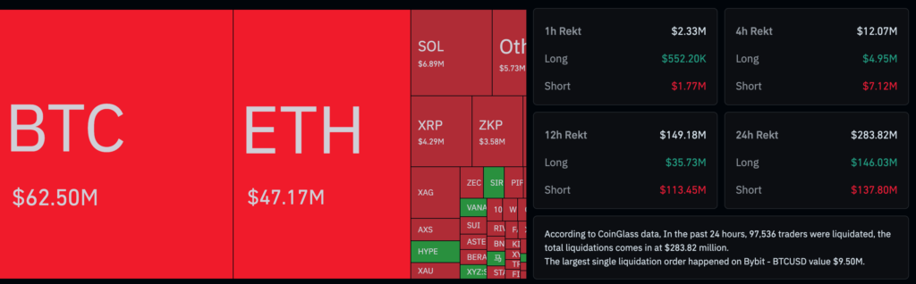 市場信心明顯仍恐慌但有些微好轉,而昨日的跟美股上漲後回落也引發小幅度的清算。根據 CoinGlass 統計 ,過去 24 小時內,全球共有近 9.7萬名交易者遭到強制平倉,總爆倉金額高達 2.88 億美元,多空雙爆,跟昨日數據相比,金額雖然略少,但人數有些微增加,顯示進入市場試圖小額抄底的人與作空的人正互相做對手。