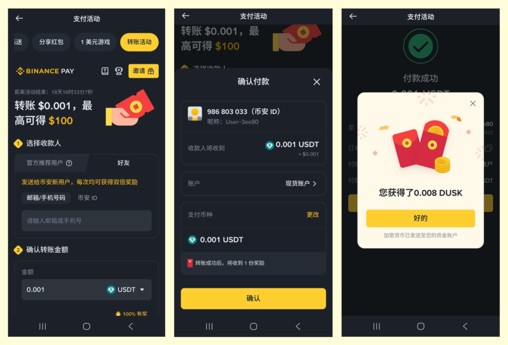 只要輸入幣安用戶的手機號碼或是幣安 ID(可以轉給自己的小號或朋友)就可以免費轉帳 – 最低 0.001 USDT,成功後就可以再多獲得一個紅包。