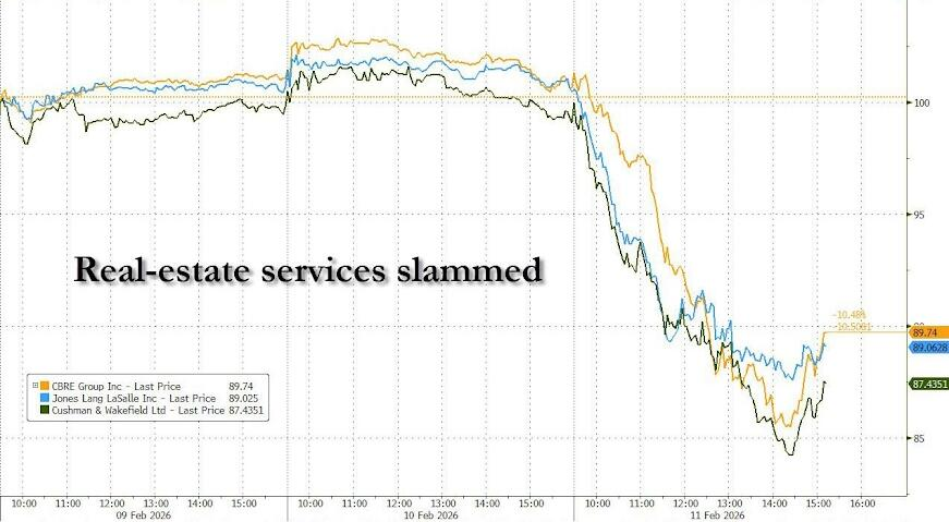 房地产服务类股遭到抛售,CBRE集团和Jones Lang LaSalle暴跌12%。