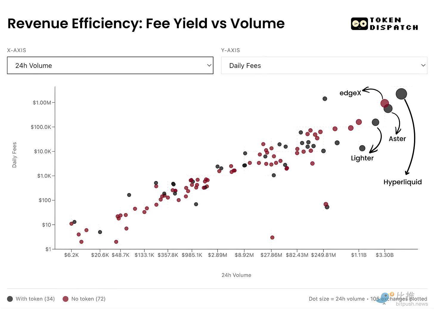 Hyperliquid 的手续费收入强化了这个故事。其变现率(Take Rate)约为 3.2 个基点,正将最大份额的 24 小时交易量转化为手续费收入。
