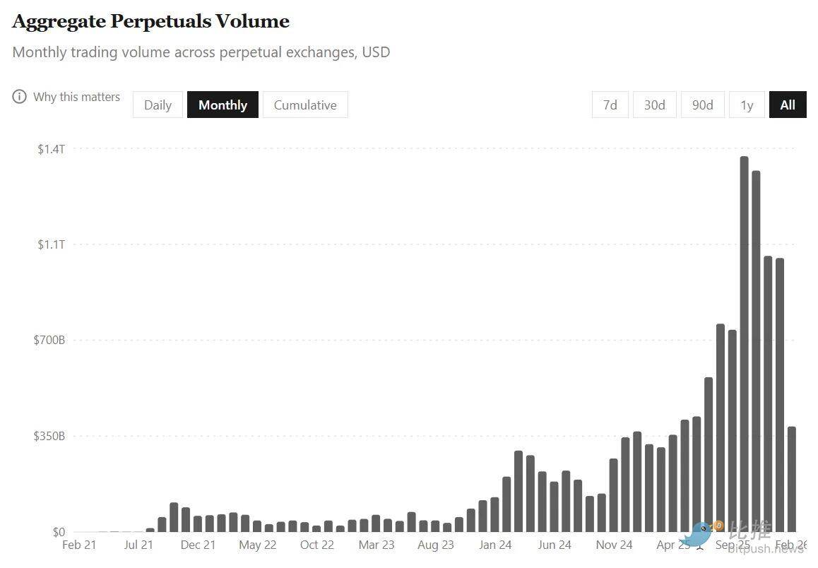 所有这些增长都是在加密货币总市值在 2025 年 8 月 1 日至 2026 年 2 月 9 日期间缩水近 40% 的背景下实现的。这一活跃度表明,交易者越来越倾向于衍生品交易、套期保值和短期定位,尤其是在现货市场变得剧烈波动且看跌时。