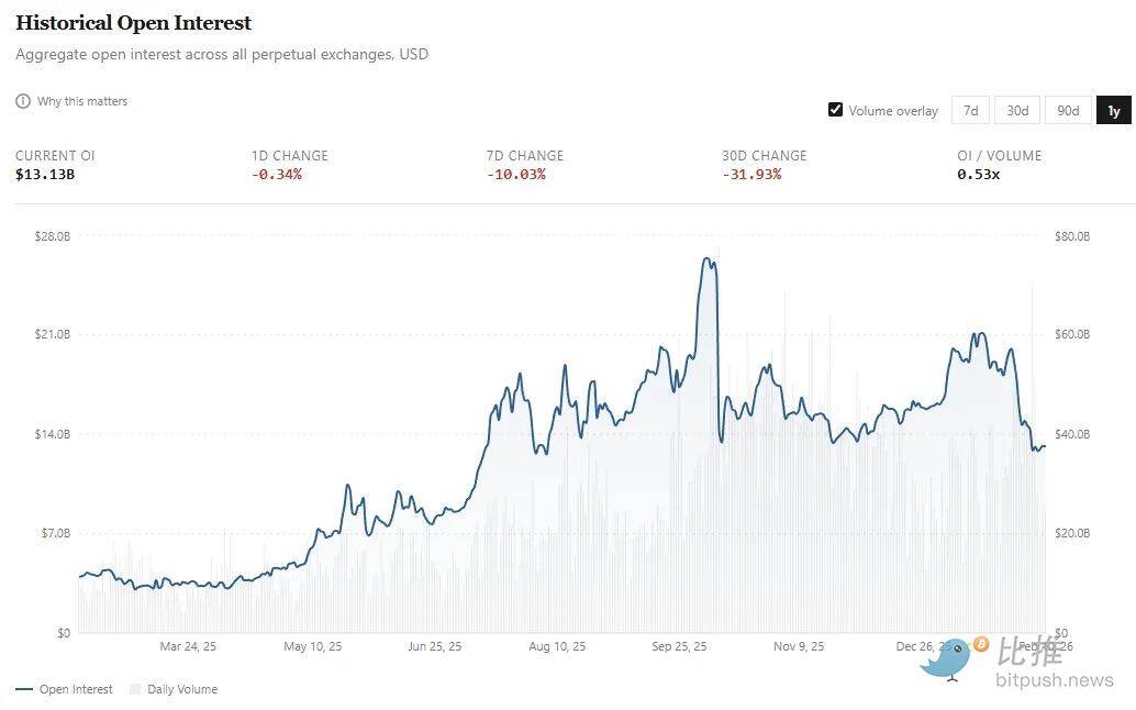 这就是观察 持仓量(Open Interest,简称 OI) 的意义所在。如果说交易量反映的是资本流动,那么 OI 衡量的是未平仓的风险敞口。在永续交易所,OI 指的是交易者持有的活跃且未结算的多头和空头合约的总美元价值。