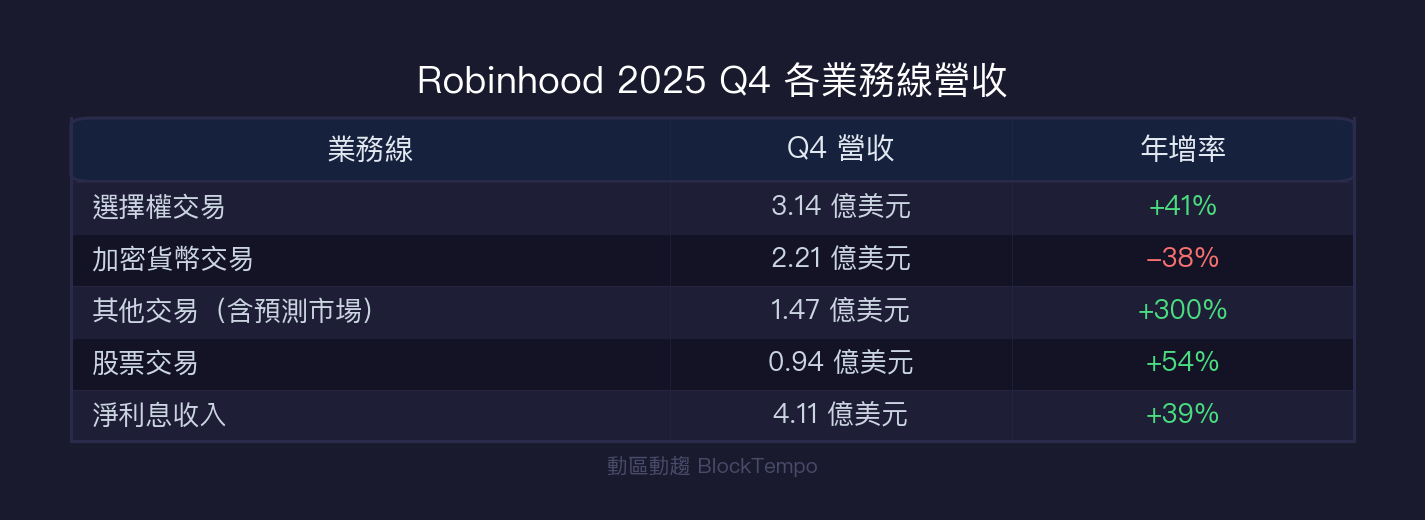 Robinhood 各業務線表現:選擇權、股票大幅成長,加密獨弱