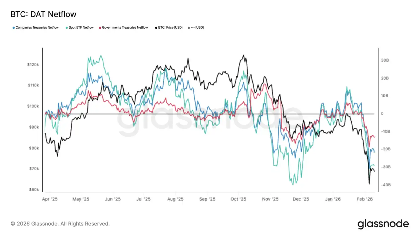 數位資產資金流最近轉負得非常明顯,ETF、企業、政府幾類機構同時在淨流出,比特幣也打到了新低。ETF 是主力,企業和政府也在減,這不是某一家在調倉,是整個市場的機構都在收縮。