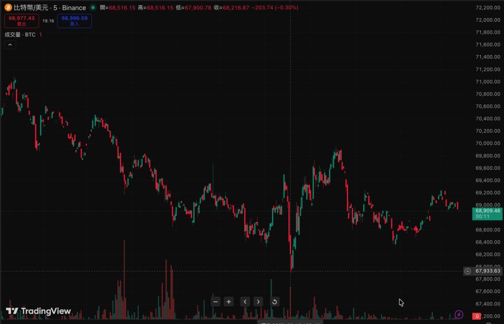 密貨幣持續走弱,沒看到回彈跡象,比特幣自昨晚 2240 跌破 67900 ,半夜一點一度叩關 70000 美元未突破,現収 69042 美元。
