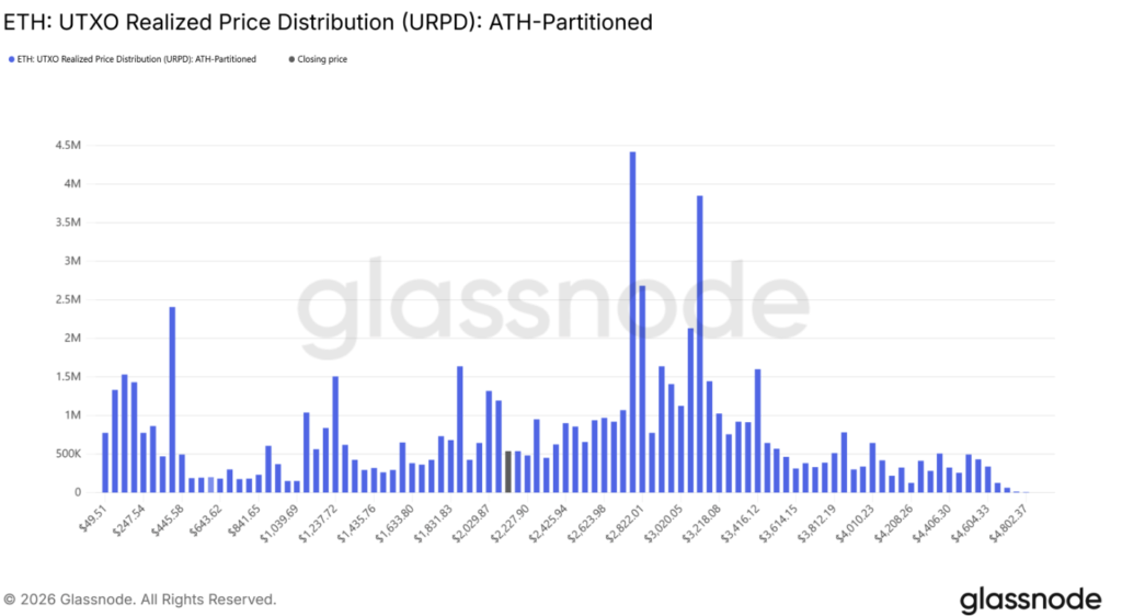 根據 Glassnode 的成本基礎分佈(CBD)數據,在 ETH 當前價格上方存在兩個巨大的供應集中區: