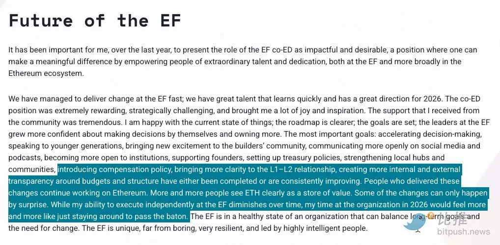 第三,也是最值得玩味的一句:「基金会的领导层越来越有信心自己做决定、自己掌控更多事务。随着时间的推移,我在基金会独立执行的能力在减弱。如果继续待下去,2026 年我更多只是在『等着交棒』。」
