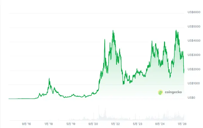 换算一下更扎心:2018 年 1 月,ETH 首次站上 1400 美元。那 1400 美元按美国 CPI 通胀复利调整,到 2026 年 2 月相当于约 1806 美元。