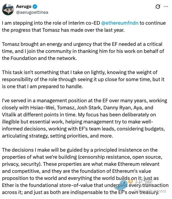 以太坊基金会联合执行主任 Tomasz Stańczak 宣布,将于本月底卸任。这距离他与 Hsiao-Wei Wang 在去年 3 月共同接替长期掌舵的 Aya Miyaguchi、组成新的领导核心,仅仅过去了 11 个月。