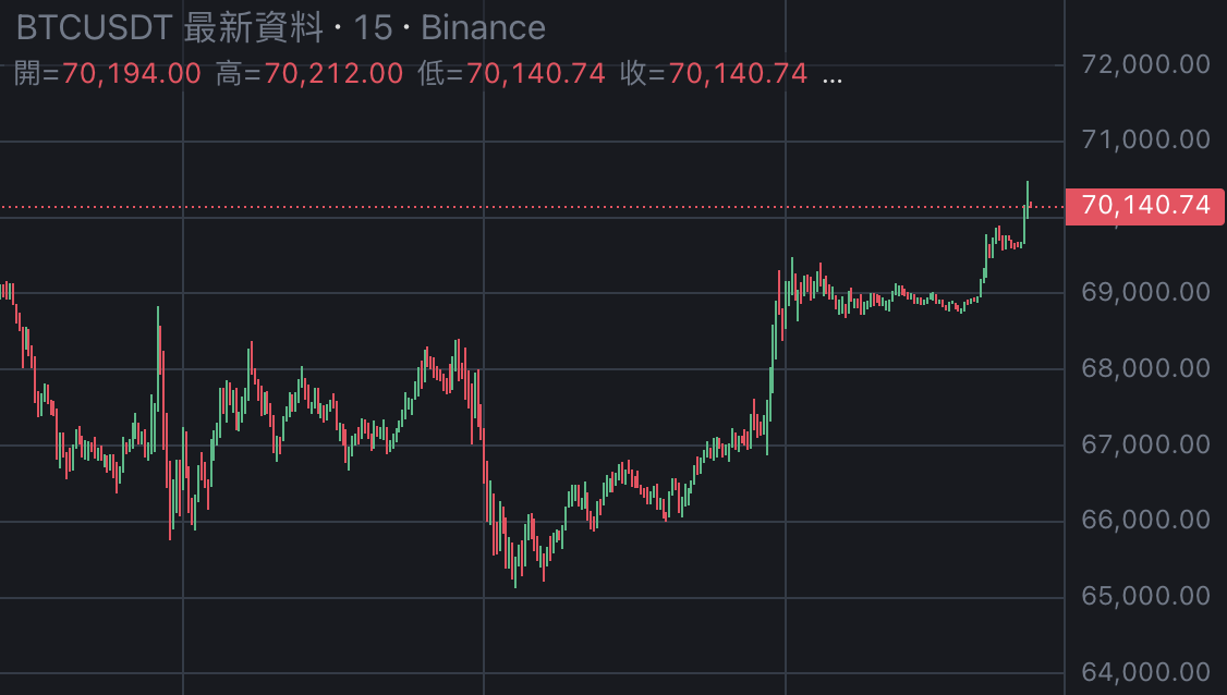 比特幣價格回升突破 70,000 美元整數關卡,現報 70,250 美元,24 小時漲幅達 4.8%。比特幣已連續數日緩慢回穩。