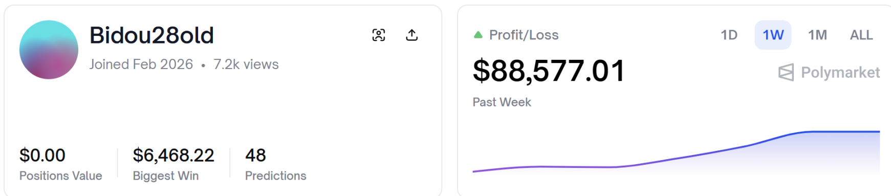 Polymarket 暱稱為 Bidou28old 的玩家(0x4460bf2c0aa59db412a6493c2c08970797b62970),今年 2 月剛入駐,僅僅不到 1 天時間,淨賺 8 萬美元。
