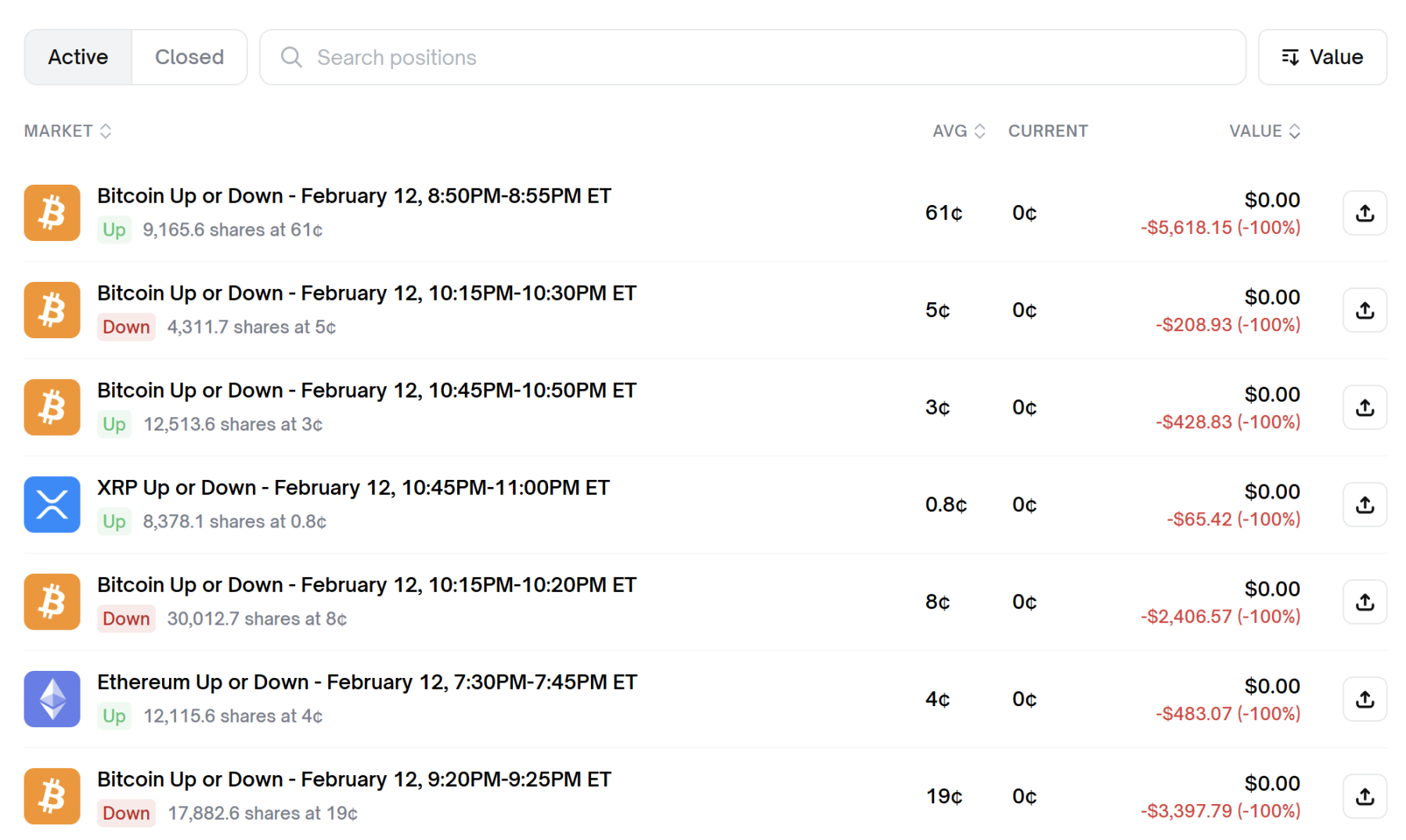 如果你從該交易員 Polymarket 地址主頁下滑,你一定會被其「虧損」驚得目瞪口呆,僅僅這 7 次虧損,數額就超過 1 萬美元。