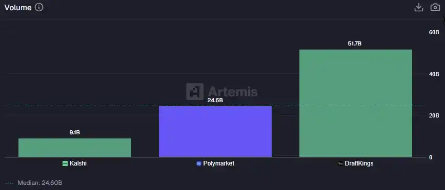 Kalshi 與 Polymarket 的現貨交易量資料來自 Artemis;DraftKings 的「交易量」則採用其 Sportsbook Handle 指標,即在其體育博彩產品中已結算的使用者投注總額。