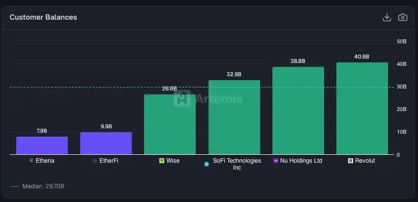 Fintech / Crypto 的客戶資金餘額對比。Wise、SoFi、Nu 的資料來自公司財報披露;Revolut 來自公開新聞稿;EtherFi 與 Ethena 的資料來自 Artemis。